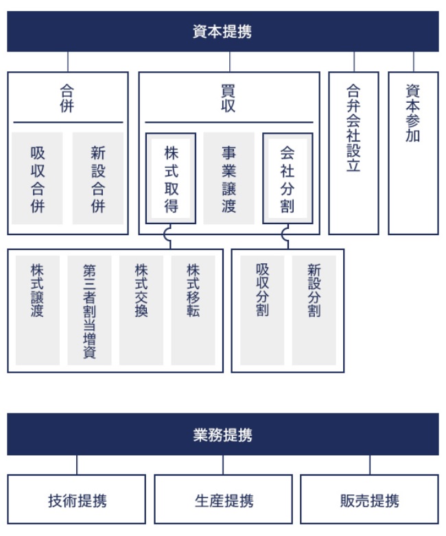 企業の提携には、資本の移動や資本参加を伴う資本提携と、資本の異動を伴わない業務提携(技術・生産・販売等に関する業務提携)に分けられ、前者「資本提携」を広義のM&Aと定義します。 広義のM&Aは「合併」「買収」「合弁会社設立」「資本参加」の4つに分かれます。 そのうち「合併」「買収」の2つを狭義のM&Aと定義します。 |